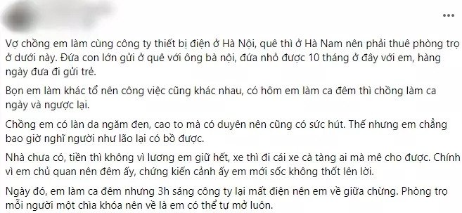 Ngày đó, em làm ca đêm nhưng 3h sáng công ty lại mất điện nên em về giữa chừng. Phòng trọ mỗi người một chìa khóa nên về là em có thể tự mở luôn.