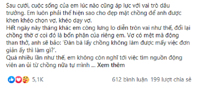 Mới đây một người vợ trẻ quá thất vọng vì chồng đã vào mạng xã hội than thở chuyện gia đình. Tâm sự của cô như sau: "Sau cưới, cuộc sống của em lúc nào cũng áp lực với vai trò dâu trưởng. Em luôn phải thể hiện sao cho đẹp mặt chồng để anh được khen khéo chọn vợ, khéo dạy vợ.