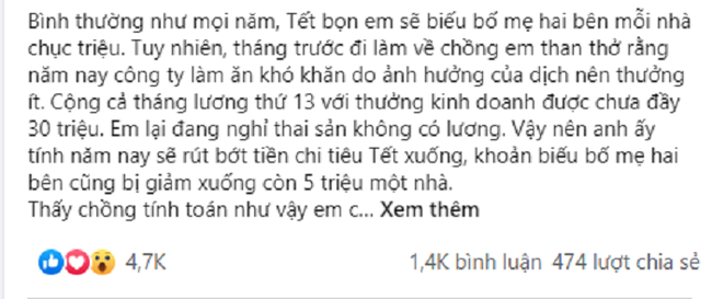 Câu chuyện như sau: "Bình thường như mọi năm, Tết bọn em sẽ biếu bố mẹ hai bên mỗi nhà chục triệu. Tuy nhiên, tháng trước đi làm về chồng em than thở rằng năm nay công ty làm ăn khó khăn do ảnh hưởng của dịch nên thưởng ít. Cộng cả tháng lương thứ 13 với thưởng kinh doanh được chưa đầy 30 triệu. Em lại đang nghỉ thai sản không có lương. Vậy nên anh ấy tính năm nay sẽ rút bớt tiền chi tiêu Tết xuống, khoản biếu bố mẹ hai bên cũng bị giảm xuống còn 5 triệu một nhà.
