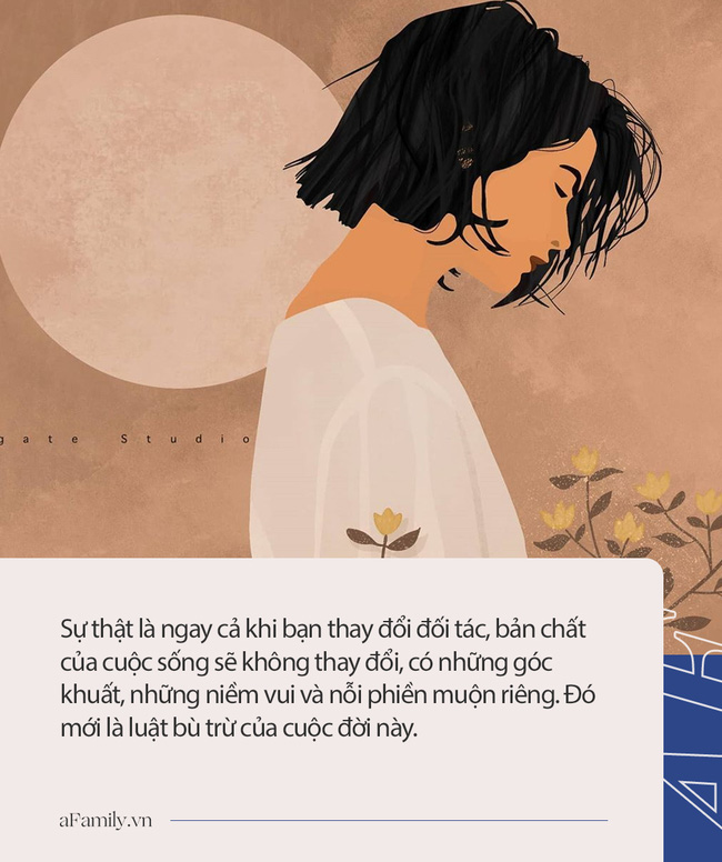 Sự thật là ngay cả khi bạn thay đổi đối tác, bản chất của cuộc sống sẽ không thay đổi, có những góc khuất, những niềm vui và nỗi phiền muộn riêng. Đó mới là luật bù trừ của cuộc đời này.