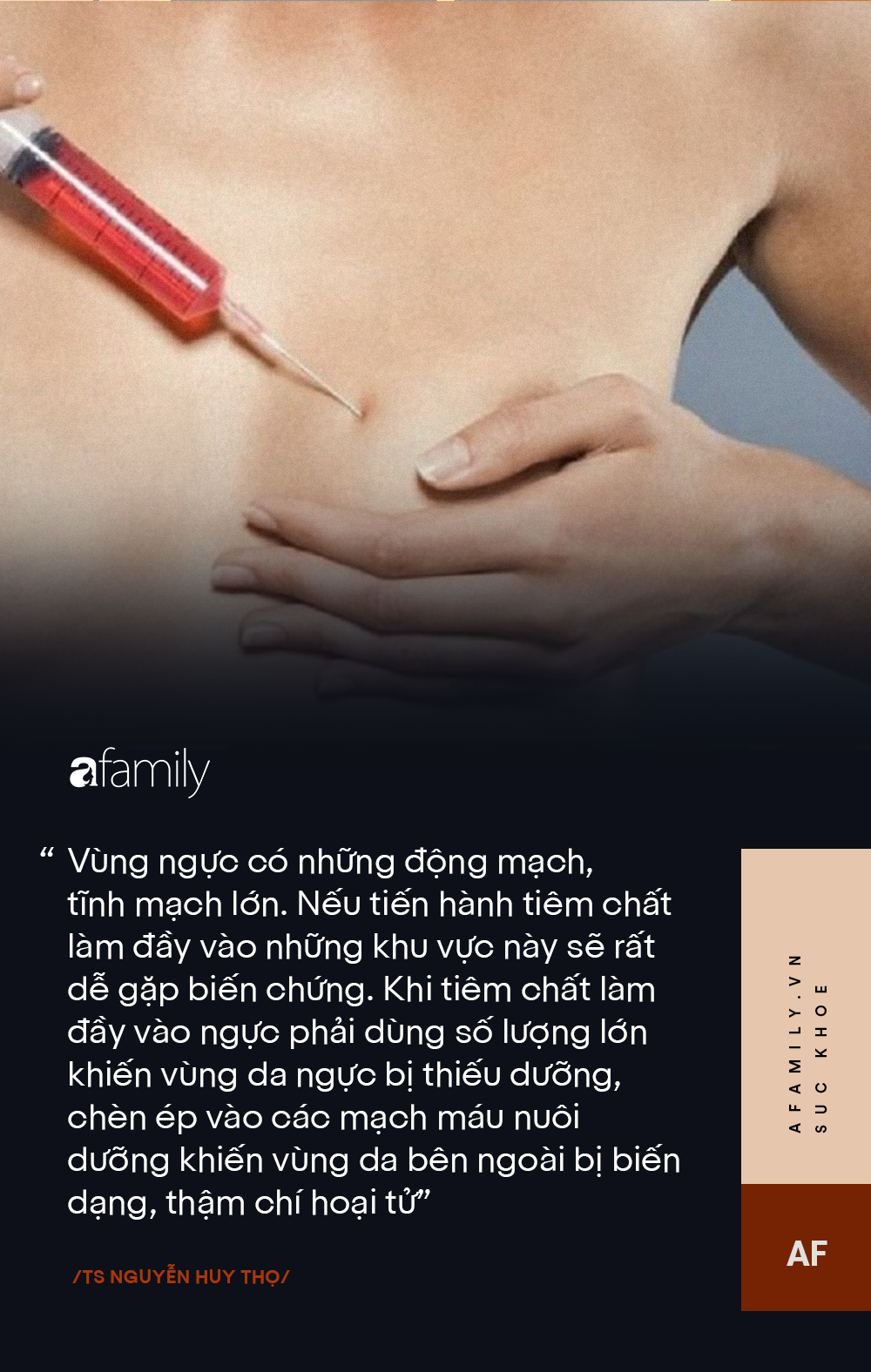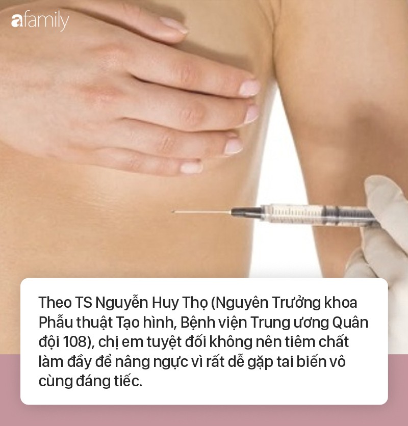 Theo TS Nguyễn Huy Thọ (Nguyên Trưởng khoa Phẫu thuật Tạo hình, Bệnh viện Trung ương Quân đội 108), chị em tuyệt đối không nên tiêm chất làm đầy để nâng ngực. Vị chuyên gia khẳng định, sử dụng chất làm đầy để nâng ngực sẽ rất dễ gây ra các biến chứng khó lường.