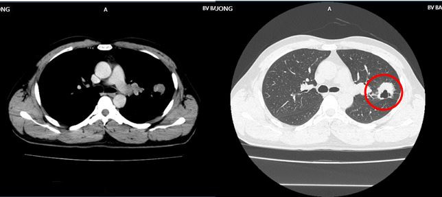 Bệnh nhân là anh H.V.H (43 tuổi) có tiền sử khỏe mạnh. Một tháng trước khi vào viện, anh H. ho khan và đau tức ngực trái. Người đàn ông này đi khám, chụp CT ngực phát hiện khối u thùy trên phổi trái kích thước 30x32mm, vài nốt mờ rải rác màng phổi 2 bên. Sau đó, anh nhập viện để điều trị.