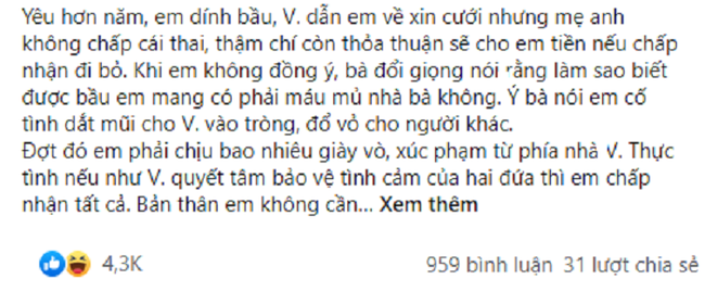 Câu chuyện như sau: "Yêu hơn năm, em dính bầu, V. dẫn em về xin cưới nhưng mẹ anh không chấp nhận cái thai, thậm chí còn thỏa thuận sẽ cho em tiền nếu em đi bỏ. Khi em không đồng ý, bà đổi giọng nói rằng làm sao biết được bầu em mang có phải máu mủ nhà bà không. Ý bà nói em cố tình dắt mũi cho V. vào tròng, đổ vỏ cho người khác.