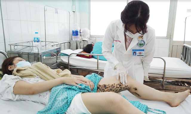 Vài ngày sau, các vết đốt mưng mủ, chảy máu, đóng mài dày,…gây đau đớn, không thể tự đi lại, sinh hoạt. Nhiều lần liên hệ cơ sở spa, chị H được hướng dẫn rằng yên tâm, uống kháng sinh, giảm đau, ăn nhiều tôm với rau muống khoảng 1 tuần sẽ khỏi. Tuy nhiên, chỗ đốt càng ngày càng đau, mưng mủ, chảy máu,… khiến chị phải nhập viện.