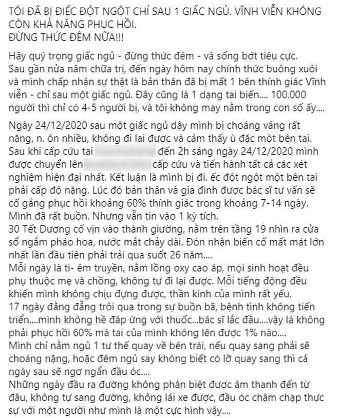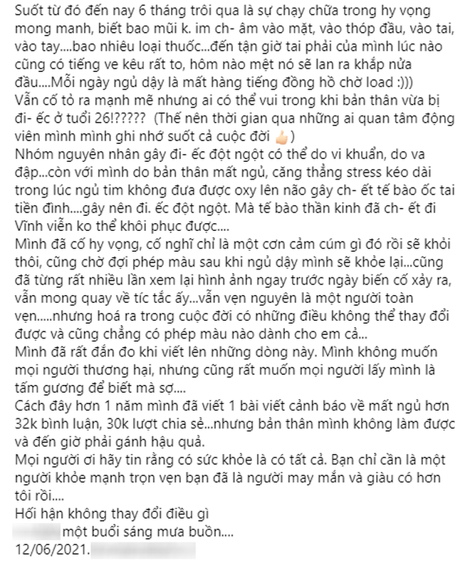 T. chia sẻ, nguyên nhân gây ra tình trạng bệnh này của cô là do bản thân thường xuyên thức khuya, mất ngủ, căng thẳng trong lúc ngủ, khiến tim không đưa được oxy lên não gây chết tế bào ốc tai tiền đình, dẫn đến điếc đột ngột và sau đó là mất thính lực hoàn toàn.