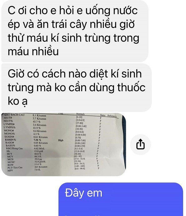 Tuy nhiên, gần đây, có không ít thông tin cho rằng, uống các loại nước ép rau quả, ăn hoa quả tươi cũng có thể gây nhiễm ký sinh trùng. Một cô gái chia sẻ trên mạng xã hội rằng, sau một thời gian chăm uống nước ép và ăn trái cây tươi, kết quả xét nghiệm cho thấy ký sinh trùng trong máu của cô nhiều