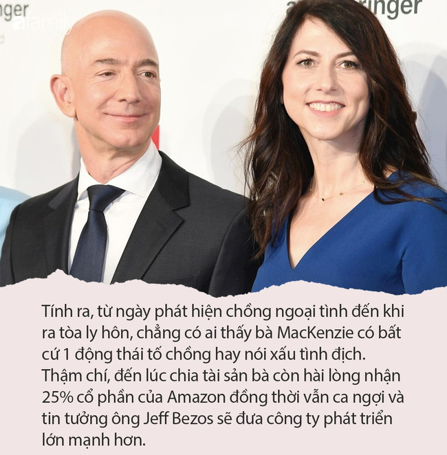 Tính ra, từ ngày phát hiện chồng ngoại tình đến khi ra tòa ly hôn, chẳng có ai thấy bà MacKenzie có bất cứ 1 động thái tố chồng hay nói xấu tình địch. Thậm chí, đến lúc chia tài sản bà còn hài lòng nhận 25% cổ phần của Amazon đồng thời vẫn ca ngợi và tin tưởng ông Jeff Bezos sẽ đưa công ty phát triển lớn mạnh hơn.