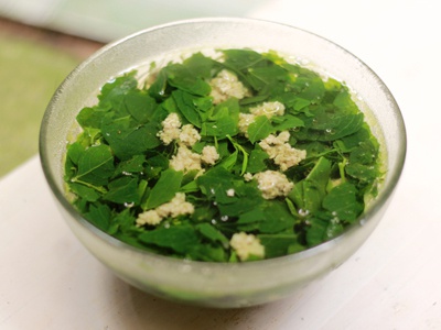 Chuẩn bị: 150g lá chùm ngây tươi, 300ml nước đã đun sôi, 2 muỗng mật ong.