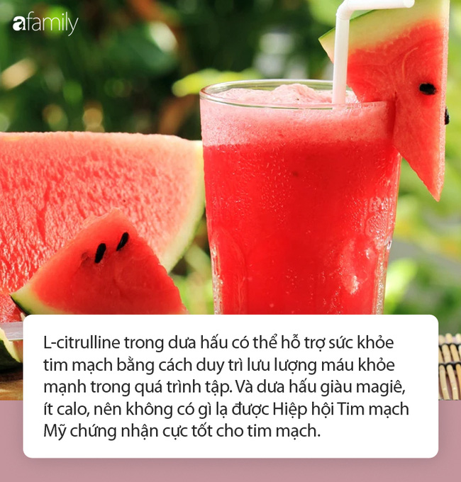Thêm vào đó, một axit amin trong dưa hấu được gọi là L-citrulline có thể hỗ trợ sức khỏe tim mạch bằng cách duy trì lưu lượng máu khỏe mạnh trong quá trình tập thể dục. Và vì dưa hấu rất giàu magiê, ít calo, nên không có gì lạ khi chúng là một loại thực phẩm đã được Hiệp hội Tim mạch Mỹ chứng nhận cực tốt cho tim mạch.