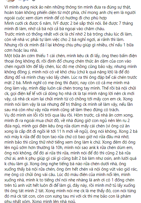 Mới đây, 1 cô vợ bức xúc chia sẻ: "Mình cưới chồng được 6 năm, IVF được 2 bé sắp thôi nôi. Bé được 7 tháng mình đi làm, nhờ cả bà nội cả bà ngoại vào chăm cháu...". Sự việc khá dài và nó dồn nén từ quá nhiều xung đột, mâu thuẫn âm ỉ bấy lâu. Điều đáng nói là không chỉ có mình vợ chồng cô mà nó liên quan đến rất nhiều người trong nhà.