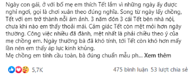 "Ngày con gái, ở với bố mẹ em thích Tết lắm vì những ngày ấy được nghỉ ngơi, gọi là chơi xuân theo đúng nghĩa. Song từ ngày lấy chồng, Tết với em trở thành nỗi ám ảnh. 3 năm đón 3 cái Tết bên nhà nội, chưa khi nào em thấy thoải mái. Cảm giác Tết còn mệt mỏi hơn ngày thường. Công việc nhiều đã đành, mệt nhất là phải chiều theo ý của mẹ chồng em. Ngày thường bà đã khó tính, tới Tết còn khó hơn mấy lần nên em thấy áp lực kinh khủng.