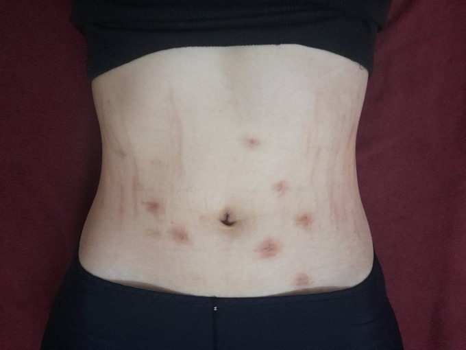 Bộ sản phẩm gồm một đai và một áo lót chống hằn, ngứa. Ngày đầu tiên đeo, Huyền đau nhức hai bên sườn eo, sau đó ngứa nhưng kiên trì dùng. Ngày thứ hai, bụng xuất hiện nhiều vết thâm, bầm tím do bị đai siết chặt. Một tuần sau, cô buộc dừng mang do đau không thể thở, đứng lên ngồi xuống khó khăn, vùng bụng bị bầm tím, lằn đỏ.