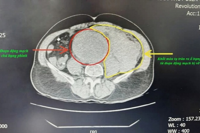 Tại bệnh viện, bệnh nhân đau bụng dữ dội, da xanh nhợt, mạch không bắt được và huyết áp không thể đo được. Kết quả chụp CT Scanner cho thấy bệnh nhân bị phình động mạch chủ ngực đoạn dưới thận lan đến động mạch chậu hai bên, trong đó khối phình đã vỡ và gây tụ máu sau phúc mạc với số lượng lớn.