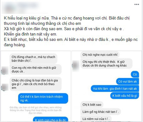 P.L chia sẻ: "Không hiểu loại người kiểu gì nữa. Thà em cứ nói chuyện đàng hoàng với chị biết đâu chị thương chị lại nhường chồng chị cho em. Xã hội bây giờ không còn đàn ông sao em. Em phải ve vãn chồng chị khiến gia đình chị tan nát. Em lại còn không biết nhục, biết xấu hổ".
