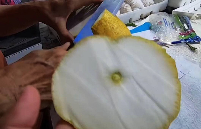 Tiếp theo đó, cô bán hàng đã nhiệt tình bổ trái kỳ đà ra để khách mua nhìn thấy rõ bên trong. Theo trải nghiệm của 2 vị khách quay video về hương vị phần cùi màu trắng thì có vẻ khá thơm, ngọt, bùi bùi và có mùi tinh dầu khá rõ. Cùi dày cả nửa gang tay, còn phần ruột bên trong thì khá bé, bổ đôi ra thì y hệt ruột bưởi.