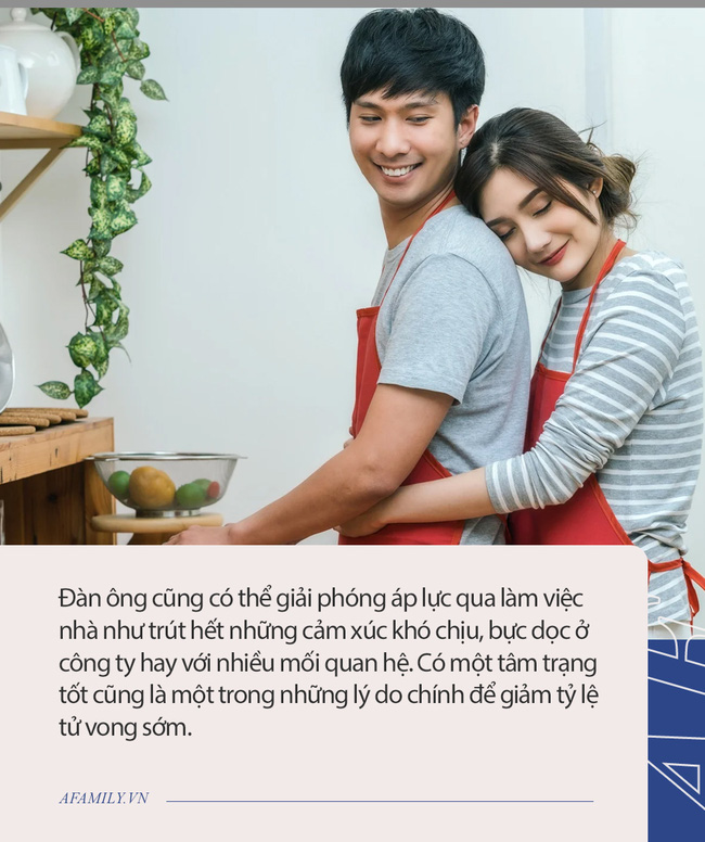Sau 9 năm theo dõi, thu lại kết quả: Đàn ông làm việc nhà, đặc biệt là hút bụi, lau sàn nhà, cọ rửa cửa sổ, rửa xe, sắp xếp đồ đạc hay làm các việc nặng trong gia đình tỷ lệ tử vong đã giảm 52%.
