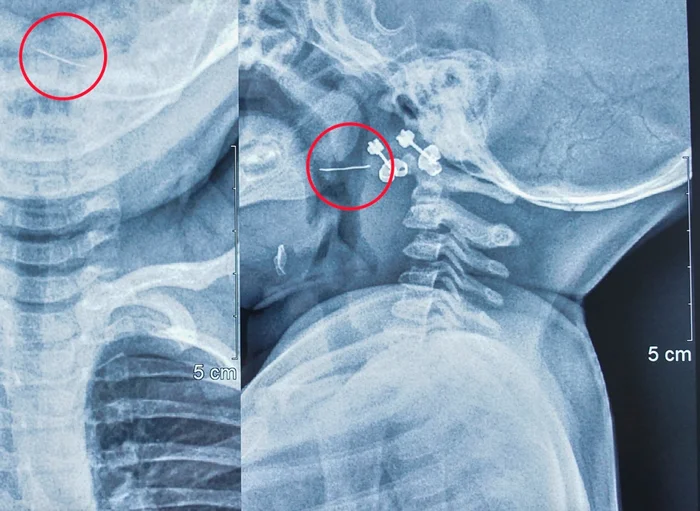 Sợi thép này đâm xuyên từ cực trên xuống cực dưới Amidan bên trái của trẻ. May mắn là dị vật chưa xuống sâu hơn nên không gây nguy hiểm đến tính mạng của trẻ. Nếu không được gắp ra kịp thời, đoạn kim loại này có thể gây nhiễm trùng và chảy máu, dẫn đến những hậu quả khó lường.