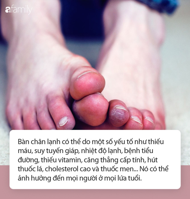 Bàn chân lạnh có thể do một số yếu tố như thiếu máu, suy tuyến giáp, nhiệt độ lạnh, bệnh tiểu đường, thiếu vitamin, căng thẳng cấp tính, hút thuốc lá, cholesterol cao và thuốc men... Nó có thể ảnh hưởng đến mọi người ở mọi lứa tuổi.
