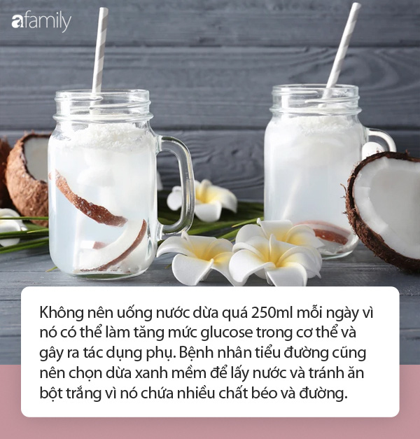 Lưu ý: Nước dừa rất tốt cho bệnh nhân tiểu đường nhưng cần uống điều độ, không lạm dụng. Không uống đều nước dừa hàng ngày, có thể cách quãng. Khi uống nước dừa, bệnh nhân tiểu đường chỉ nên uống vào buổi sáng – thời điểm tốt nhất, tránh uống khi đầy bụng, khó tiêu, khi đi nắng về, không uống vào buổi tối.