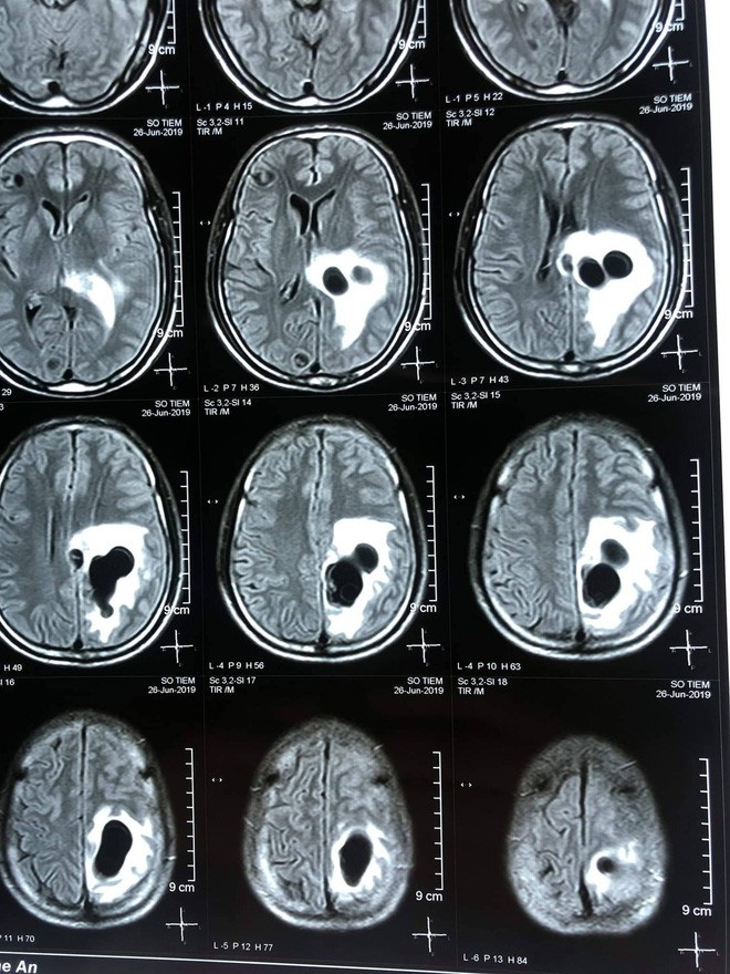 Qua thăm khám và chụp CT não cho thấy có 5 ổ sán nằm rải rác trong não bệnh nhân S.. Trong đó có một ổ sán lớn trên đỉnh của bệnh nhân gây phù não. Bệnh nhân sau đó được chỉ định can thiệp ngoại khoa để lấy được trọn vẹn ổ nang sán khỏi não.