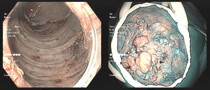 Hình ảnh nội soi đường tiêu hóa phát hiện đám tổn thương dạng u ống tuyến lan tỏa tại trực tràng. Tổn thương chiếm 2/3 chu vi trực tràng lan xuống ống hậu môn.