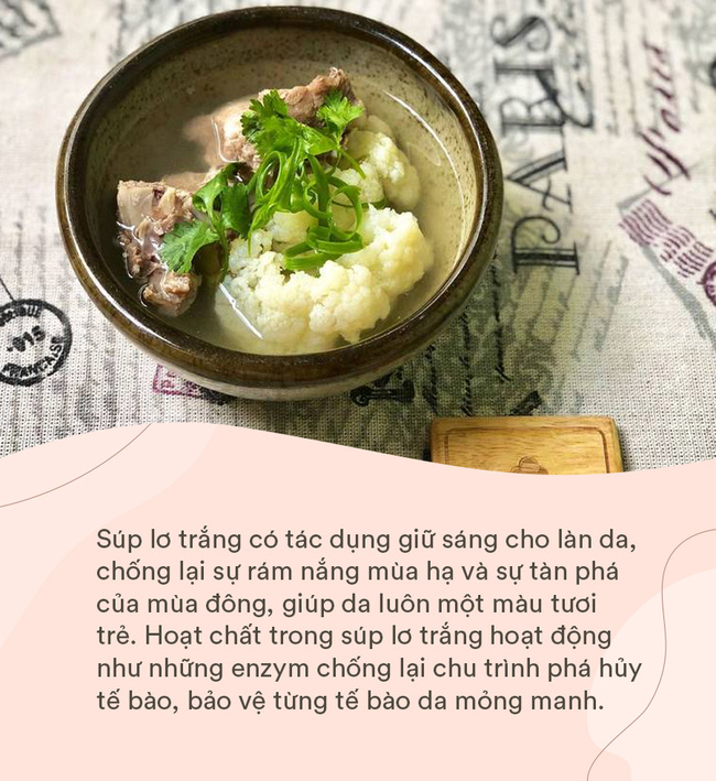 Theo các chuyên gia, chỉ cần ăn khoảng 1 cốc súp lơ trắng cắt nhỏ, bạn đã bổ sung khoảng 50ml nước cùng hàng loạt dưỡng chất thiết yếu cho sức khỏe. Nhờ vậy mà da đỡ khô và mất nước hơn trong mùa đông.