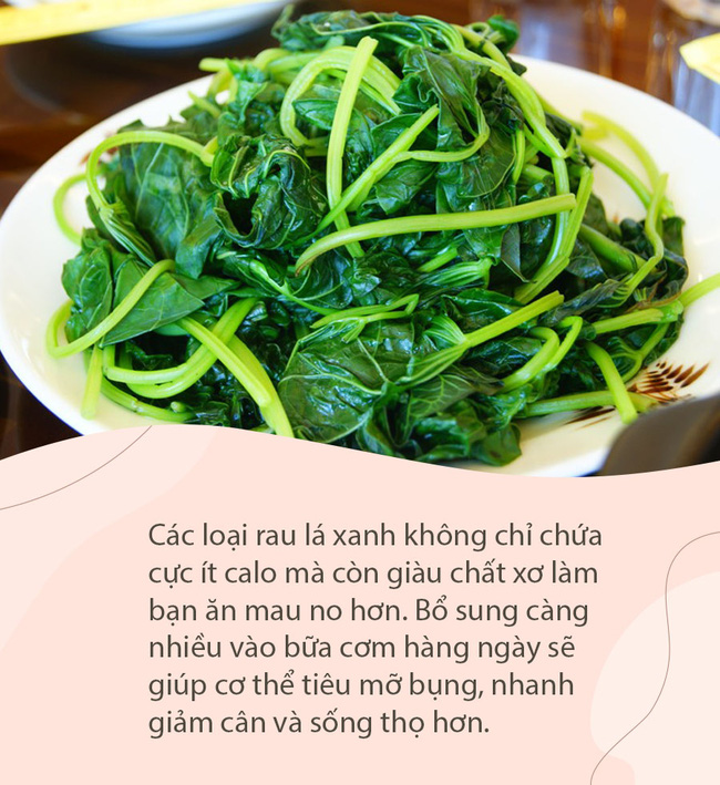 Từ lâu có lẽ ai cũng biết ăn nhiều rau sẽ giúp giảm cân, nhưng liệu bạn đã hiểu nguyên do đằng sau chưa? Cụ thể, các loại rau lá xanh không chỉ chứa cực ít calo mà còn giàu chất xơ làm bạn ăn mau no hơn. Bổ sung càng nhiều vào bữa cơm hàng ngày sẽ giúp cơ thể tiêu mỡ bụng, nhanh giảm cân và sống thọ hơn.