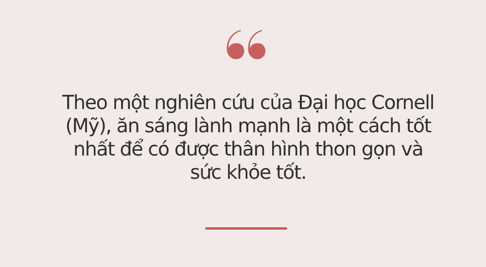 Nhiều người thường cố gắng nhịn ăn sáng để giảm cân nhưng sự thật không phải vậy. Theo một nghiên cứu của Đại học Cornell (Mỹ), ăn sáng lành mạnh là một cách tốt nhất để có được thân hình thon gọn và sức khỏe tốt. Để có được kết quả này, các nhà nghiên cứu đã thực hiện khảo sát trên 147 người phụ nữ có thân hình cân đối, họ chưa bao giờ phải cố gắng để giảm cân. 96% trong số họ ăn sáng gần như mỗi ngày.