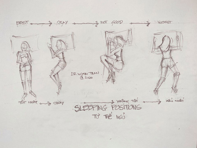 - Tư thế ngủ ảnh hướng đến giấc ngủ ngon. Tư thế nằm ngửa, thẳng chân tay là tốt nhất.