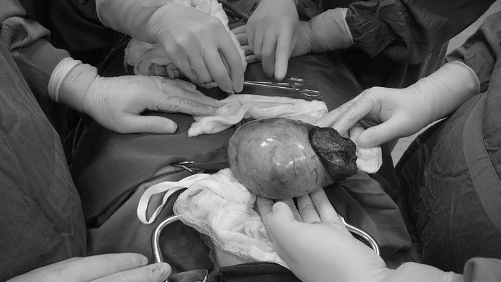 Trong quá trình phẫu thuật, bác sĩ phát hiện ổ bụng bệnh nhân có dịch đỏ loãng khoảng 200ml, khối u thuộc buồng trứng phải to khoảng 15x15 (cm), không còn phần buồng trứng lành, góc trái khối u đã vỡ dài khoảng 5cm, lộ ra nhiều khối u nhỏ, bên trong có dịch đen nâu.