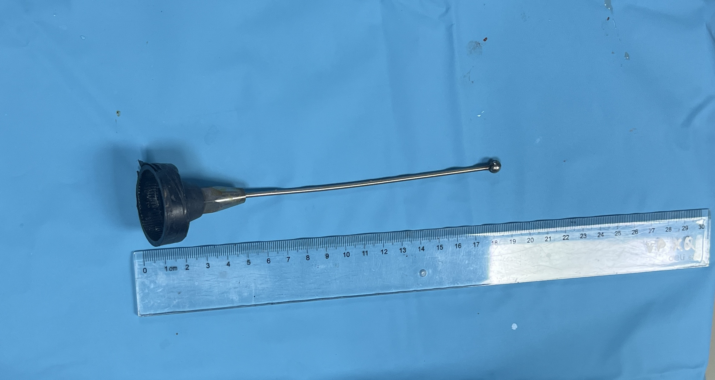 Người bệnh được chỉ định chụp cắt lớp đa dãy cấp cứu kịp thời để đánh giá tổn thương. Trên hình ảnh phim chụp cho thấy thanh dị vật dài 170x6mm, trong đó đoạn nằm trong sọ dài 12 cm ở vị trí rất nguy hiểm.