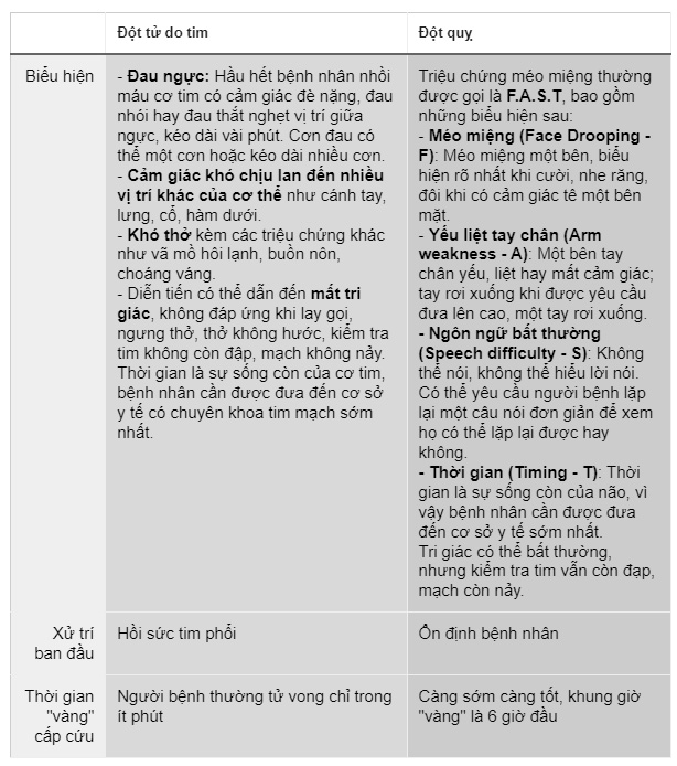 Chia sẻ với Tri thức Trực tuyến, thạc sĩ, bác sĩ Giang Minh Nhật, khoa Nội tim mạch, Bệnh viện Nhân dân Gia Định (TP.HCM), tóm tắt sự khác biệt trong biểu hiện của đột tử do nhồi máu cơ tim cấp và đột quỵ như sau: