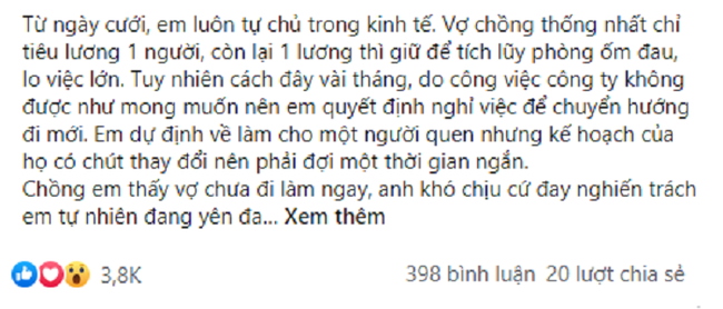 Cũng vì bức xúc với cách hành xử thiếu tôn trọng vợ của chồng mà mới đây, một người vợ đã lên mạng xã hội chia sẻ câu chuyện gia đình mình như sau: "Từ ngày cưới, em luôn tự chủ trong kinh tế. Vợ chồng thống nhất chỉ tiêu lương 1 người, còn lại 1 lương thì giữ để tích lũy phòng ốm đau, lo việc lớn. Tuy nhiên cách đây vài tháng, do công việc công ty không được như mong muốn nên em quyết định nghỉ việc để chuyển hướng đi mới. Em dự định về làm cho một người quen nhưng kế hoạch của họ có chút thay đổi nên phải đợi một thời gian ngắn.