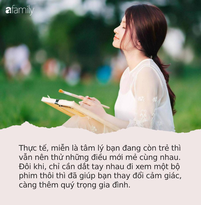 Thực tế, miễn là tâm lý bạn đang còn trẻ thì vẫn nên thử những điều mới mẻ cùng nhau. Đôi khi, chỉ cần dắt tay nhau đi xem một bộ phim thôi thì đã giúp bạn thay đổi cảm giác, càng thêm quý trọng gia đình. Hãy tổ chức nhiều hoạt động giải trí hơn để khiến cuộc sống thêm phần thú vị nhé.