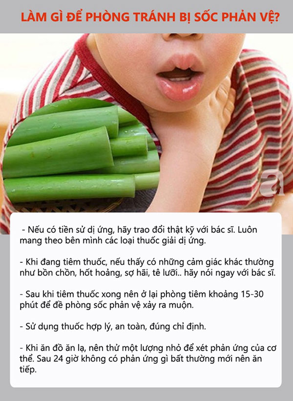 Sốc phản vệ có thể xảy ra bất cứ lúc nào và trong bất cứ hoàn cảnh nào. Hậu của của sốc phản vệ vô cùng nguy hiểm nếu không được cấp cứu kịp thời. Vì vậy, khi cơ thể có dấu hiệu bất thường sau khi tiếp xúc với các dị nguyên như ong đốt, kiến đốt, tiêm, uống thuốc, ăn các loại thực phẩm... cần đến ngay cơ sở y tế gần nhất để được cấp cứu kịp thời.