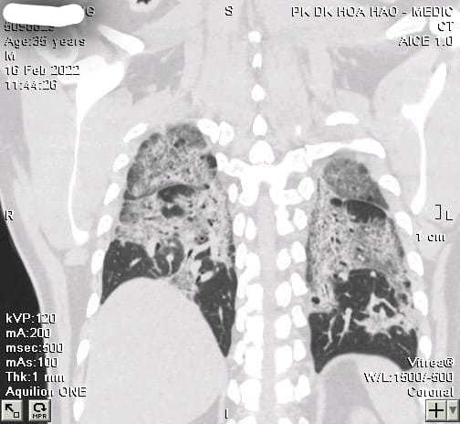 Bà T. đi khám hậu Covid-19, kết quả chụp X-quang cho thấy xơ phổi hậu Covid, tổn thương xơ phổi nặng hai bên. Tình trạng tổn thương dạng mô kẽ rải rác hai phổi, xơ rải rác hai phổi, giãn phế quản rải rác hai phổi. Bà T. phải điều trị dài ngày, đến nay chưa khỏi.