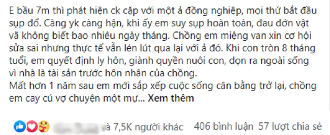 Cũng từng trải qua đổ vỡ, tổn thương tinh thần như thế, mới đây một người vợ đã lên mạng xã hội chia sẻ về câu chuyện hôn nhân của mình. "Em mang bầu 7 tháng thì phát hiện chồng cặp với một ả đồng nghiệp, mọi thứ bắt đầu sụp đổ. Càng yêu càng hận, khi ấy em suy sụp hoàn toàn, đau đớn vật vã không biết bao nhiêu ngày tháng. Chồng em miệng van xin cơ hội sửa sai nhưng thực tế vẫn lén lút qua lại với ả đó. Khi con tròn 8 tháng tuổi, em quyết định ly hôn, giành quyền nuôi con, dọn ra ngoài sống vì nhà là tài sản trước hôn nhân của chồng.
