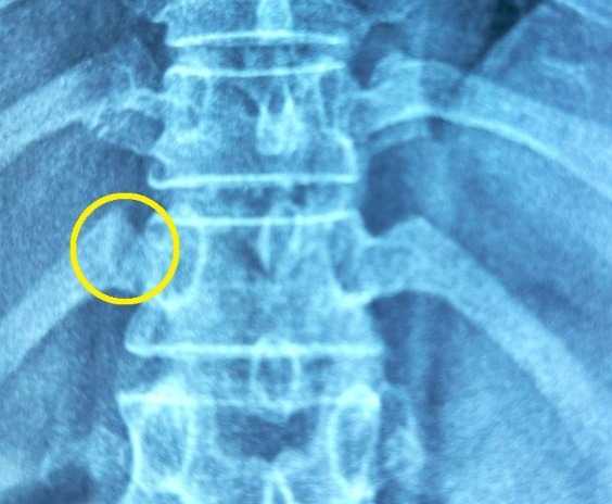 Kết quả phim chụp X-quang cho thấy xương sườn số 12 bị gãy phạm khớp sườn cột sống. Bác sĩ xử trí laser giảm đau, thuốc giảm đau tại chỗ. Sau 15 phút, bệnh nhân có thể ngồi dậy, sau đó dần tỉnh táo và đi lại.