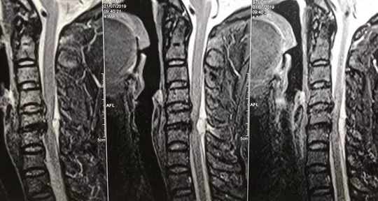 Sau khi thăm khám, bệnh nhân được chỉ định chụp cộng hưởng từ để tìm nguyên nhân. Kết quả cho thấy bệnh nhân có một khối máu tụ lớn đang chèn ép nặng cột sống cổ và là nguyên nhân gây liệt hai chân của bệnh nhân. Ngay trong đêm, bệnh nhân được mổ cấp cứu. Sau 2 giờ phẫu thuật, bệnh nhân đã được giải phóng khối máu tụ lớn trong cột sống cổ gây chèn ép tuỷ thần kinh. Sau hơn 1 tuần điều trị, bệnh nhân vừa được xuất viện.