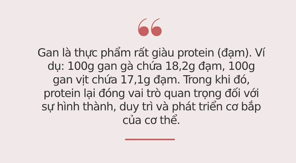 Nghiên cứu khoa học cũng đánh giá, gan là thực phẩm rất giàu protein (đạm). Ví dụ: 100g gan gà chứa 18,2g đạm, 100g gan vịt chứa 17,1g đạm. Trong khi đó, protein lại đóng vai trò quan trọng đối với sự hình thành, duy trì và phát triển cơ bắp của cơ thể.