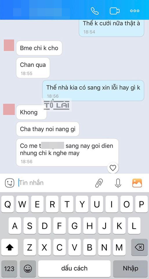 Trong dòng tin nhắn đính kèm, cô dâu hụt còn tâm sự rằng bố mẹ mình không cho cưới nữa, chán quá. Nhà chồng thì: 'Chả thấy nói năng gì. Có mẹ ông kia sáng nay gọi điện nhưng chị không nghe máy'.