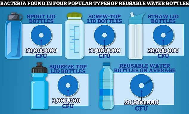 Với số lượng trung bình là 20,8 triệu CFU,các chai nước dùng nhiều lần có thể chứa lượng vi khuẩn gấp 40.000 lần so với nắp bồn cầu, 15 lần so với bát ăn chó mèo và 5 lần so với chuột máy tính.