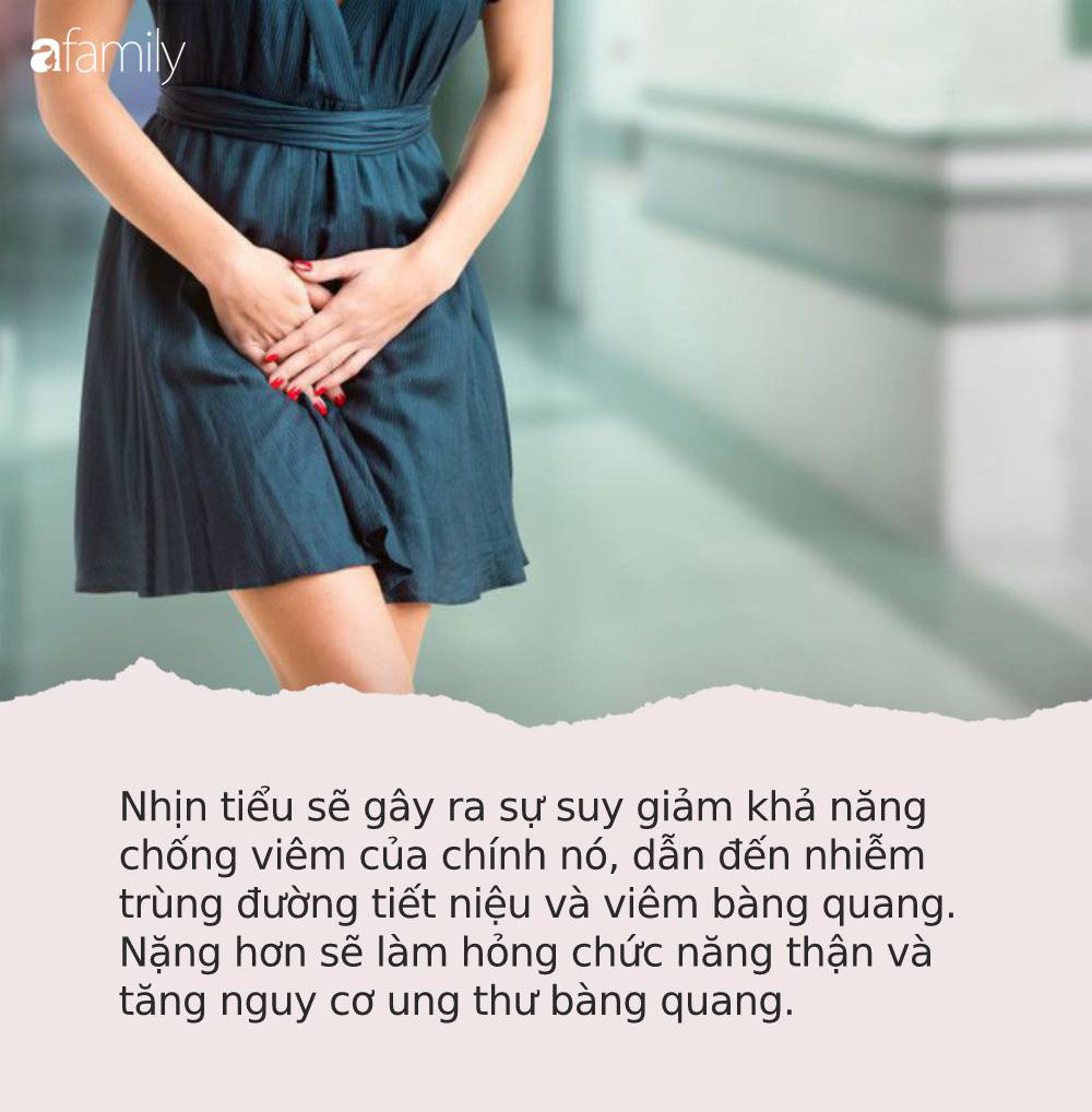 Một vài cá nhân thường hay nhịn tiểu chỉ vì lười đứng dậy đi vệ sinh, hay lý do khách quan hơn là không có nhà vệ sinh gần đó. Nhưng bạn lại không biết rằng, nhịn tiểu sẽ gây ra sự suy giảm khả năng chống viêm của chính nó, dẫn đến nhiễm trùng đường tiết niệu và viêm bàng quang. Nặng hơn sẽ làm hỏng chức năng thận và tăng nguy cơ ung thư bàng quang.