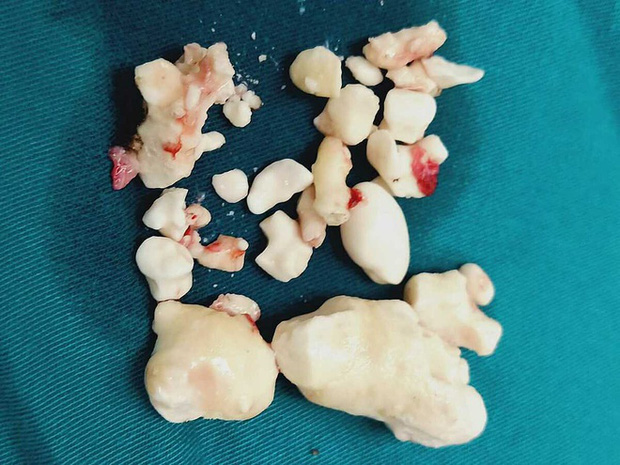Qua xét nghiệm và kiểm tra hình ảnh, TS.BS Ôn Quang Phóng, khoa Ngoại Tiêu hóa, phát hiện tụy của bệnh nhân chứa rất nhiều viên sỏi với kích thước lớn. Các bác sĩ đã tiến hành phẫu thuật cho bệnh nhân và gắp ra hơn 20 viên sỏi, nhiều viên kích cỡ lớn.