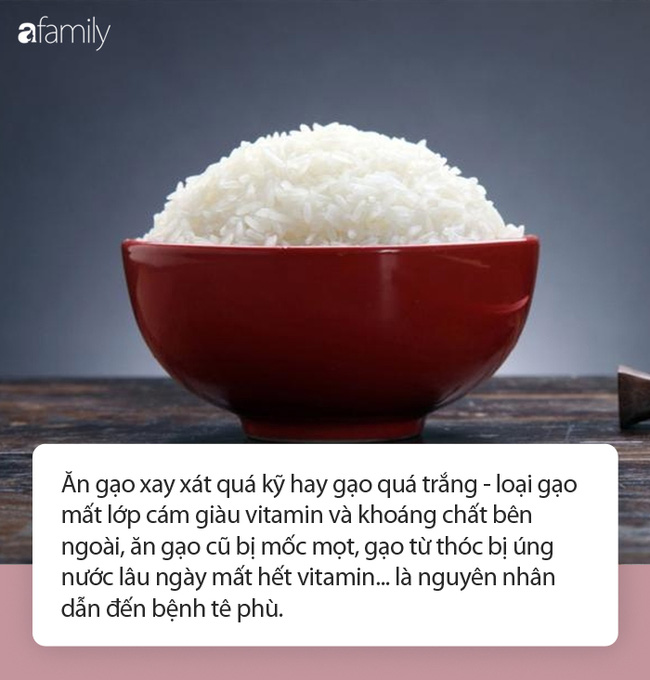 "Ăn gạo xay xát quá kỹ hay gạo quá trắng - loại gạo mất lớp cám giàu vitamin và khoáng chất bên ngoài, ăn gạo cũ bị mốc mọt, gạo từ thóc bị úng nước lâu ngày mất hết vitamin... là nguyên nhân dẫn đến bệnh tê phù. Ngoài ra chủ yếu ăn cơm gạo trắng cũng có thể là nguyên nhân dẫn đến tình trạng này. Nhưng cần lưu ý, không phải cứ bổ sung thực phẩm khác, loại bỏ hẳn cơm trắng thì đảm bảo không mắc bệnh. Nếu vẫn ăn những loại rau củ quả chứa ít vitamin B1 thì bạn vẫn có nguy cơ bị tê phù. Tốt nhất là bổ sung thức ăn giàu vitamin B1 đi kèm cơm như thực phẩm giàu chất đạm, rau xanh, hoa quả tươi...", chuyên gia nhận định.