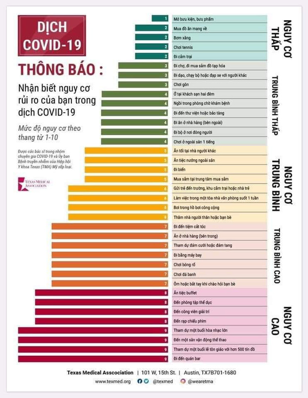 Mới đây, các bác sĩ trong nhóm chuyên gia COVID-19 và Ủy ban Bệnh truyền nhiễm của Hiệp hội Y khoa Texas (TMA) Mỹ đã lập ra một danh sách để xếp hạng xem những hoạt động nào trong ngày dễ lây nhiễm COVID-19 nhất.