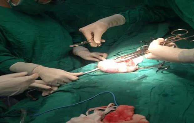 Tiến hành phẫu thuật và vào đến ổ bụng, các bác sĩ phát hiện một khối u nang rất lớn. Lúc này, ê-kip mổ tiến hành chọc và hút ra từ khối u khoảng 2 lít dịch.