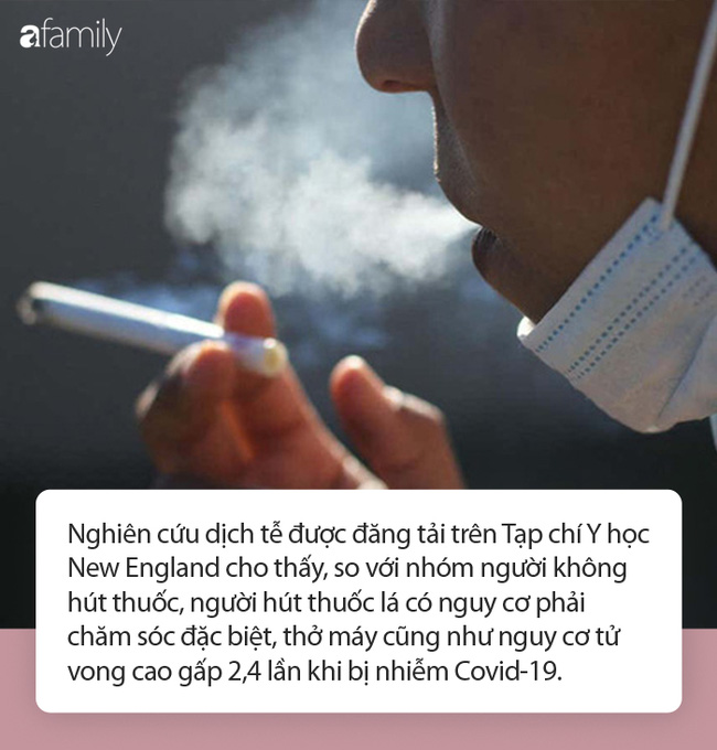 Nghiên cứu dịch tễ được đăng tải trên Tạp chí Y học New England cho thấy, so với nhóm người không hút thuốc, người hút thuốc lá có nguy cơ phải chăm sóc đặc biệt, thở máy cũng như nguy cơ tử vong cao gấp 2,4 lần khi bị nhiễm Covid-19.