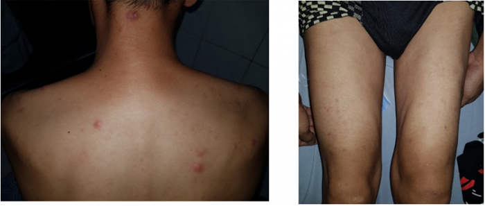 Khi khám lâm sàng, bác sĩ phát hiện tổn thương khá chắc, đau khi ấn, kích thước đa dạng từ 1-3 cm, phân bố rải rác khắp vùng mặt, tay chân, thân mình.