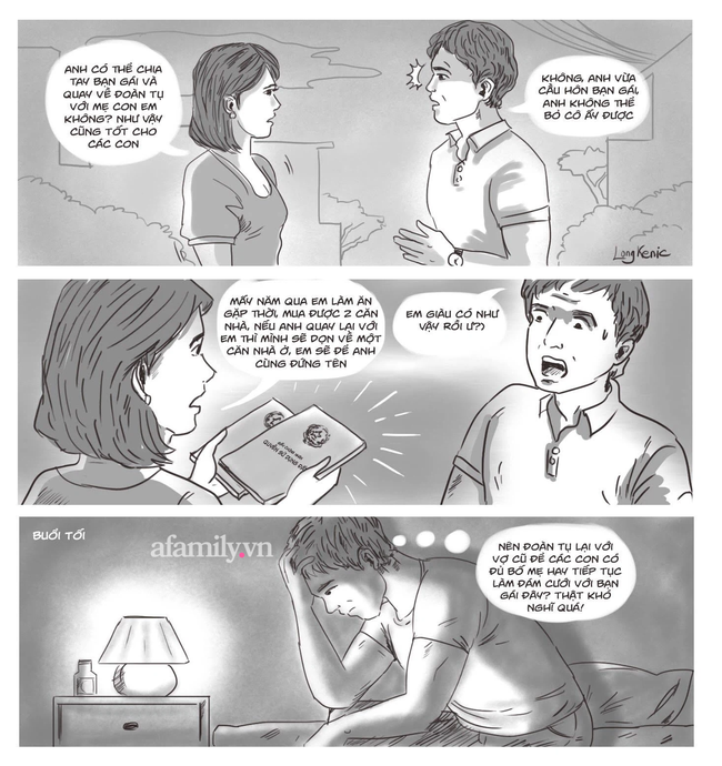 Sau khi hỏi han tình hình công việc và cuộc sống, vợ cũ đột nhiên hỏi tôi có thể chia tay bạn gái để đoàn tụ với cô ấy hay không? "Em cũng chỉ nghĩ cho con cái mà thôi. Mỗi người có gia đình mới, các con là thiệt thòi nhất".